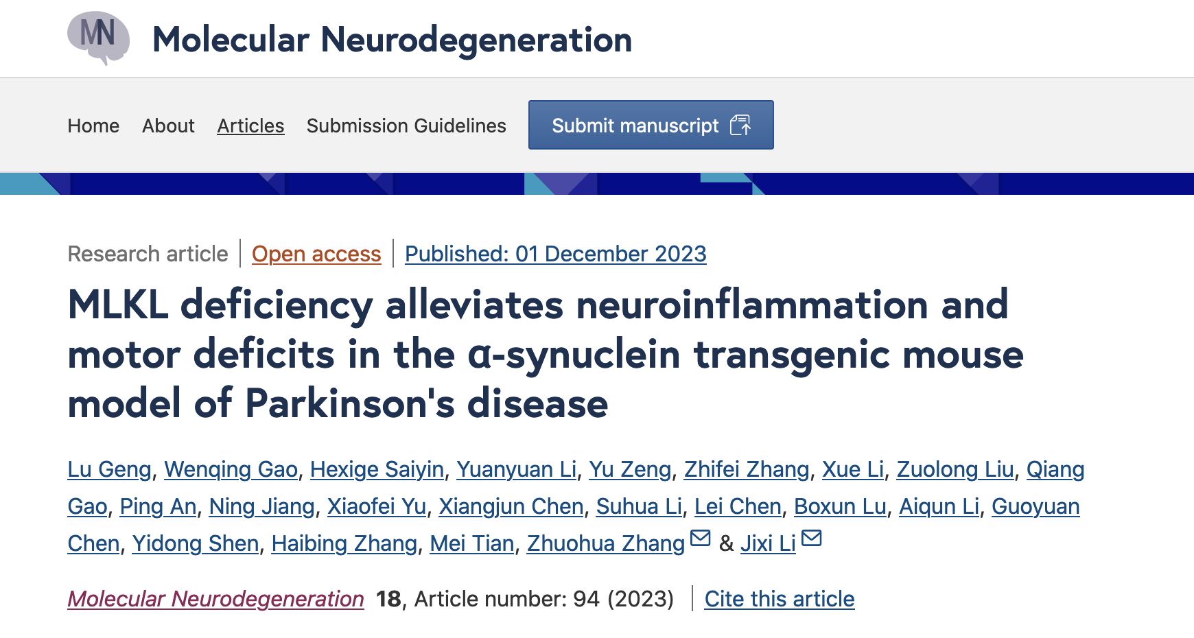 帕金森病是一种以多巴胺能神经元丧失和α-突触核蛋白(α-synuclein)聚集为特征的神经系统疾病,但目前缺乏有效治疗手段。贝博体育官网 /华山医院李继喜教授、中南大学湘雅医院/南华大学张灼华教授合作在细胞程序性坏死调控帕金森病(PD)发生的机制方面取得重要进展,发现MLKL缺失可以显著缓解α-突触核蛋白突变导致的帕金森病模型小鼠的神经炎症和运动障碍症状。12月1日,研究论文以《MLKL deficiency alleviates neuroinflammation and motor deficits in the α-synuclein transgenic mouse model of Parkinson’s disease》为题在线发表在国际神经科学领域权威期刊《分子神经退行性疾病》(Molecular Neurodegeneration)(影响因子:15.1)杂志上。