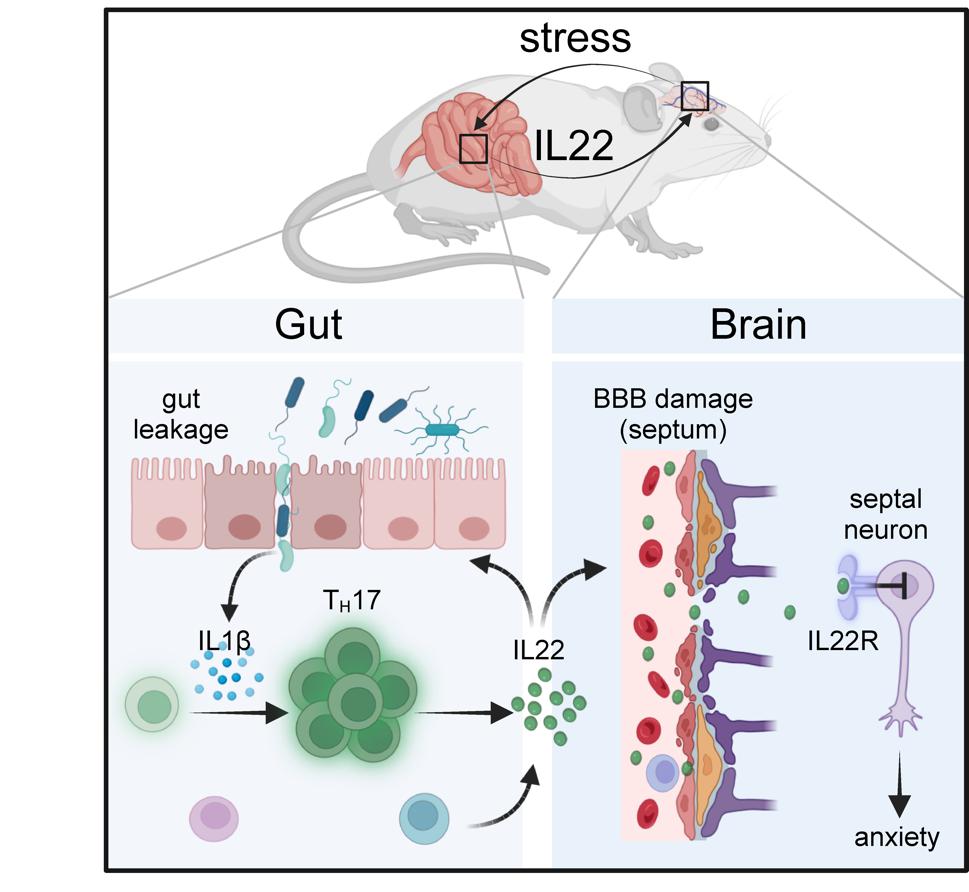 2024年12月6日,贝博体育官网 于肖飞团队在Immunity发表了题目为Elevated IL-22 as a result of stress-induced gut leakage suppresses septal neuron activation to ameliorate anxiety-like behavior的文章,报道了在压力诱导的免疫系统早期激活阶段,肠道中的TH17细胞增多并增加白细胞介素(interleukin)22(IL-22)的产生,IL-22可通过直接抑制脑隔区神经元的激活而降低小鼠的焦虑行为,从而揭示IL-22介导的脑肠轴可减轻精神压力对机体的影响。