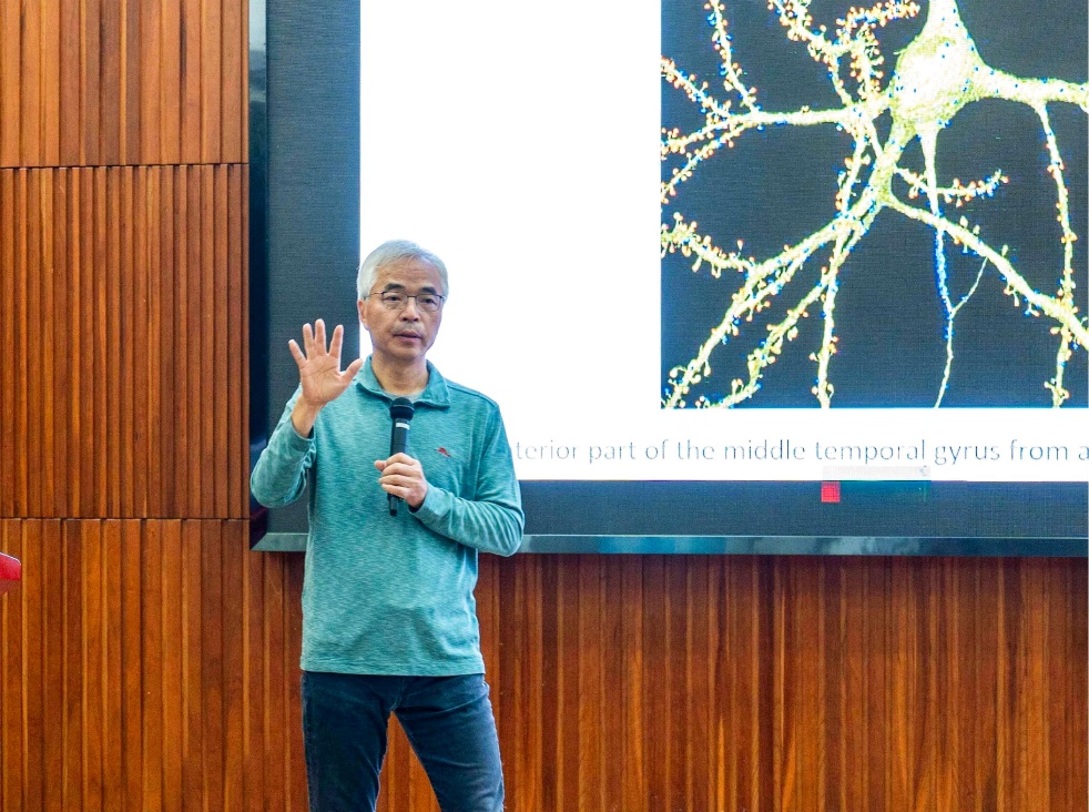 温子龙教授报告题目为《斑马鱼小胶质细胞的起源于发育》,小胶质细胞是中枢神经系统(CNS)中特化的组织驻留巨噬细胞,它们在调节CNS的发育和稳态中发挥着关键作用。同时,许多神经退行性疾病,如多发性硬化症、阿尔茨海默病等均与小胶质细胞功能异常相关。然而,目前对于小胶质细胞在CNS中建立和维持的机制仍知之甚少。通过以斑马鱼为模式生物的研究,温教授揭示了小胶质细胞的发育起源,并进一步解析了它们在不同发育阶段的斑马鱼CNS中定殖和维持的机制。从发现RBI和AGM两种小胶质细胞发育过程中存在细胞竞争,到探究两种不同小胶质细胞间竞争的分子机制,再到最后发现IL34-CSF1R信号在调控小胶质细胞适应性、更新和寿命方面具有高度保守性,温教授将整段研究过程娓娓道来。