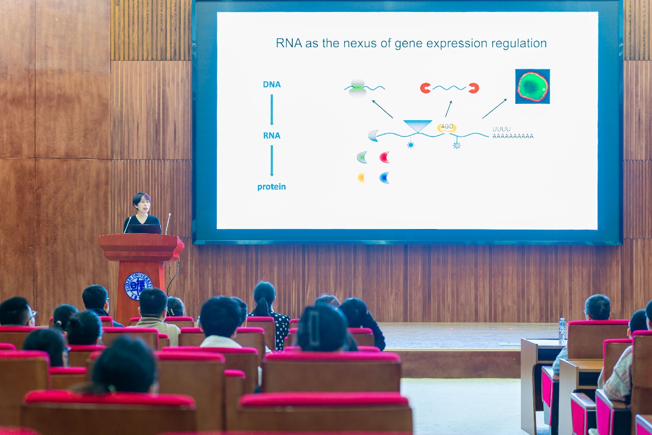 聂明副院长主持并致欢迎辞,介绍了陈雪梅教授杰出的科研工作。陈教授1988年从北京大学生科院本科毕业后同年通过考取中美生物化学联合招生项目CUSBEA的方式被录取到美国康奈尔大学攻读博士;1995年博士毕业后在加州理工贝博 从事博士后研究;陈教授1999年在美国罗杰斯大学建立自己的实验室。陈教授实验室的研究起始于植物花发育的遗传调控机制研究,早期的工作鉴定了多个花发育经典ABC模型的核心因子,并给自己发现的基因命名为HUA1和HUA2,源自中国传统汉字的拼音。在研究花发育的过程中陈教授是最先在植物体中分离出小RNA的研究团队之一。首次发现小RNA在3’末端核糖基上带有甲基化修饰,并克隆负责该修饰的酶HEN1,证明该修饰对于维持小RNA的稳定非常重要,为小RNA领域的重要发现之一;首次证明植物中miRNA介导靶基因的翻译抑制过程发生在内质网上。基于在小RNA领域这一系列原创性的科研成果,陈教授先后获得美国植物学会Charles Albert Shull奖、美国HHMI研究员、美国戈登与贝蒂莫尔基金会研究员;当选美国科学促进会会士、美国国家科贝博 院士。