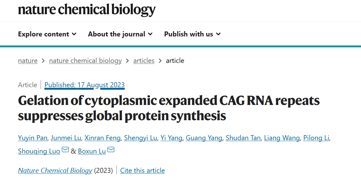 2023年8月17日,复旦大学鲁伯埙课题组同合作者英国普利茅斯大学罗寿青、清华大学李丕龙等在Nature Chemical Biology杂志上发表题为Gelation of cytoplasmic expanded CAG RNA repeats suppresses global protein synthesis的文章,证实了包含过长CAG重复序列的RNA在细胞质内的胶体化,并发现该胶体化过程可通过“囚禁”重要的翻译延伸因子eEF2从而导致细胞全局蛋白质合成速度的下降。研究进一步在动物实验中提示含过长CAG重复序列RNA的胶体化可能导致神经退行性疾病相关的表型及神经电生理变化。