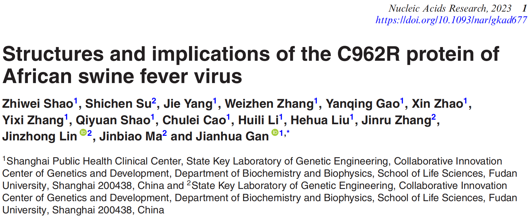 2023年8月17日,复旦大学甘建华课题组在Nucleic Acids Research上发表了题为“Structures and implications of the C962R protein of African swine fever virus”的文章,报道了非洲猪瘟病毒来源的C962R蛋白与DNA复合物的结构,阐明了C962R催化DNA解旋以及DNA引物合成的分子机制。