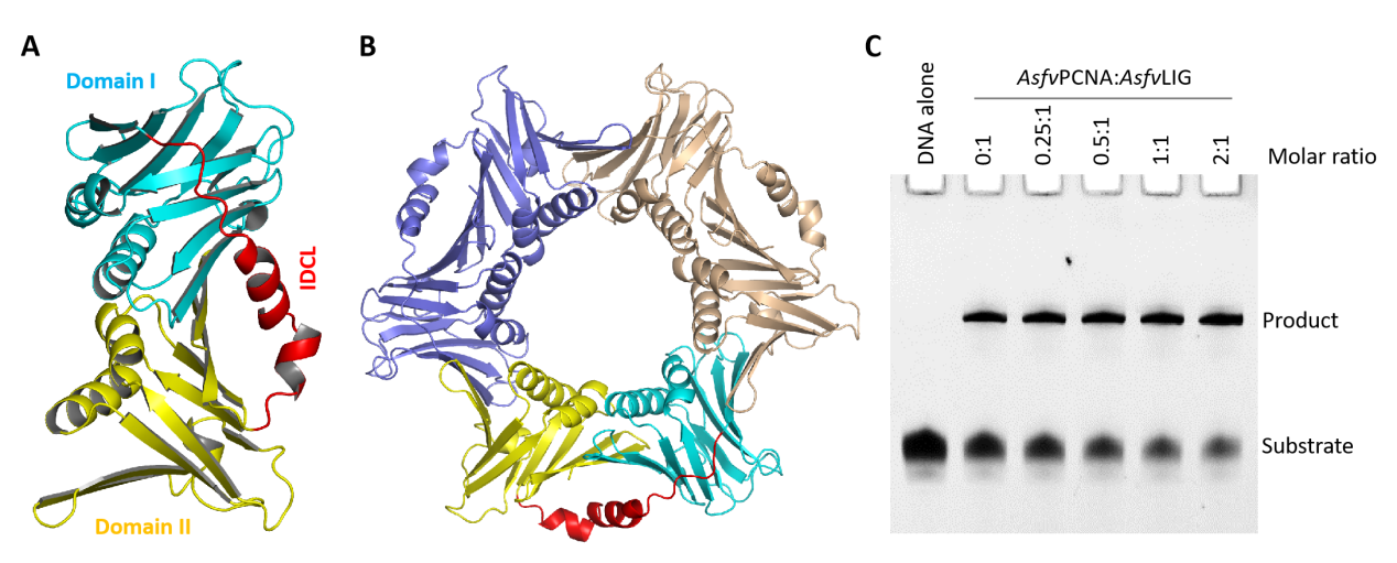 文章的研究结果显示AsfvPCNA蛋白由两个相似的结构域(Domain I和II)组成,其连接区域(IDCL)含有两个短的螺旋。与同源蛋白类似,AsfvPCNA主要以三聚体形式存在,其中心的孔道富含碱性氨基酸,可以像夹子一样卡在双链DNA上,并沿着DNA滑动。体外生化实验显示,AsfvPCNA具有很强的双链DNA结合能力,其独特的IDCL在AsfvLIG等互作蛋白的识别过程中发挥了作用,可以阻止互作蛋白从DNA上脱落,进而显著地提高其催化效率。