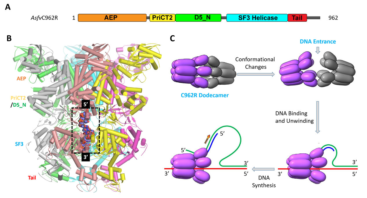 C962R是ASFV DNA复制通路中的关键蛋白之一,在ASFV病毒株中高度保守。尽管C962R的敲除不能完全阻断ASFV的复制,却可以有效延缓受感染猪的临床症状的发生。论文研究显示C962R为多结构域蛋白,其N端的AEP结构域负责新生DNA的从头合成及延伸,而其SF3 Helicase结构域则负责ATP分子的水解以及双链DNA的解旋。不同于常规的SF3 Helicase家族蛋白,C962R蛋白为环状的12聚体,由两个6聚体head-to-head互作形成。DNA底物的入口处于6聚体的结合界面处,DNA非模版链的3’端可通过此入口进入C962R结构中心的孔道,利用SF3 Helicase结构域水解ATP、驱动蛋白质构象的变化以及DNA的解旋。尽管不参与直接的催化和解旋,C962R的PriCT2、D5_N以及Tail结构域参与DNA的结合,其构象变化对DNA解旋以及新生DNA的从头合成发挥了调控作用。C962R的DNA解旋和合成机制相对保守,但是在Tail等结构域的折叠方式上则与同源蛋白有明显的区别。