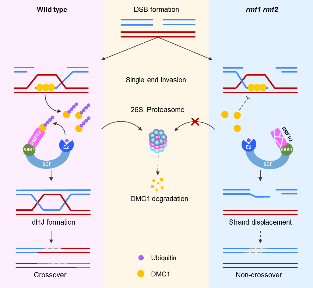 综上所述,本研究首次在鉴定到了减数分裂功能性F-box蛋白RMF1/2,揭示了RMF1/2介导DMC1的泛素化并通过26S蛋白酶体降解的分子机制。由于减数分裂重组和重组酶DMC1在真核生物中的高度保守性,我们推测本研究发现的DMC1泛素化调控和降解机制在真核生物中也相对保守。同时也证实了DMC1的稳态维持机制是保证减数分裂重组顺利进行的基础。研究结果不仅丰富了减数分裂重组的分子机制,还为作物遗传育种及人类生殖健康提供了理论基础。