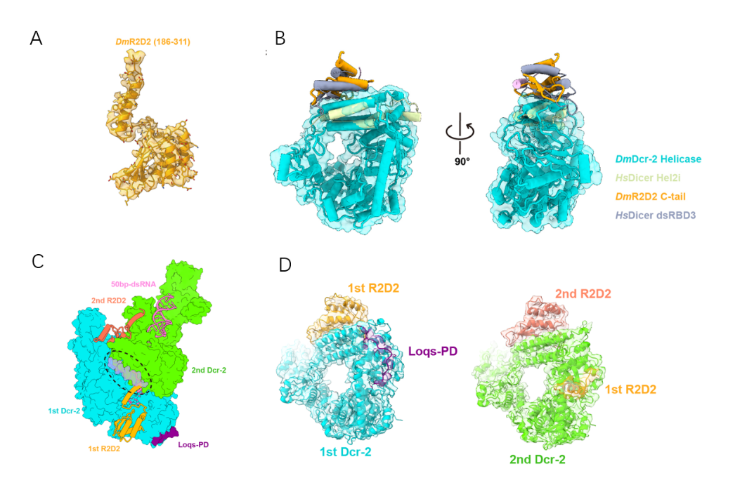 两种寡聚体都表现出了相似的排列方式。结构分析表明,R2D2的C端由一段α-螺旋和C端结构域组成,而且C端结构域的二级结构由α-β-β-β-α组成,这与dsRBDs具有相似的结构特征。此外,R2D2通过该区域与 Dicer2的 Hel2i亚结构域结合,其结合位置和结合方式与哺乳动物Dicer与TRBP结合方式一致。因此,可以推断 R2D2与TRBP功能具有相似性(图2A,B)。R2D2还包括一个独特的α-螺旋(这里称其为bridge-helix),在寡聚体中它连接了两个Dicer2单体,通过突变等分析表明这段序列对于寡聚体的稳定具有重要作用(图2C)。在寡聚体中的第一个Dicer2上可以同时看到R2D2和Loqs-PD的密度,这表明了它们对于Dicer2的功能并不相互排斥。然而,当形成寡聚体时,R2D2的bridge-helix可以占据邻近 Dicer2与 Loqs-PD的结合位置,从而抑制了Loqs-PD的结合(图2D)。这可能是 R2D2对于Loqs-PD功能抑制的一种新的形式。