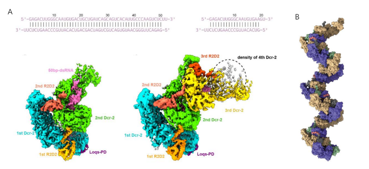 为了模拟Dicer/R2D2/Loqs-PD分别与剪切底物和产物的相互作用方式,该研究工作分别报道了该蛋白复合物与50bp的dsRNA与19bp的siRNA duplex的结构,结构表明Dicer/R2D2/Loqs-PD可以与50bp的dsRNA可以形成RNA长度依赖的寡聚体;而与19bp的siRNA duplex形成了不依赖于RNA长度的更大的寡聚体,并且可以沿一维延伸生成类似RIGI-like receptors (RLRs)家族寡聚形成的弹簧形状的纤维。