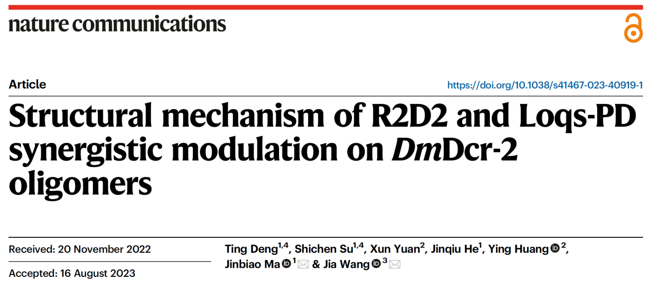 2023年8月26日,贝博体育官网 麻锦彪教授与清华大学贝博 王家博士在《自然-通讯》(Nature Communications)杂志上在线发表题为“R2D2和 Loqs-PD协同调节 DmDcr-2寡聚体的结构机制”(Structural mechanism of R2D2 and Loqs-PD synergistic modulation on DmDcr-2 oligomers)的研究论文。该工作发现Loqs-PD与R2D2可以与Dicer2形成稳定的三元复合物,并且在dsRNA和ATP存在的条件下形成寡聚体,并通过冷冻电镜技术揭示了该寡聚体的高分辨率结构,这对于更加深入理解果蝇体内RNA干扰通路具有重要意义。