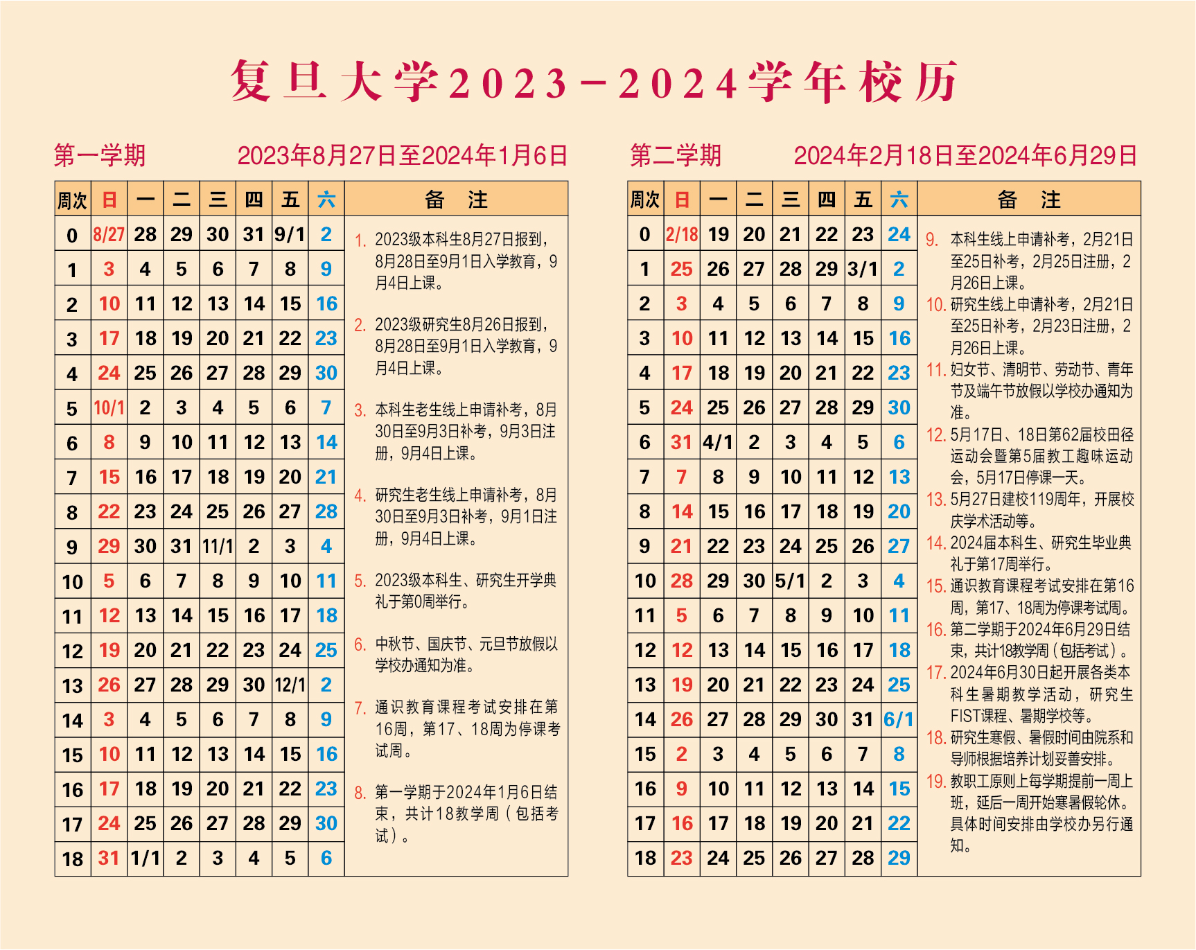 2024年春季学期于2月26日(第1周周一)开始上课,本学期授课时间16周(12月22日为第16周周五),第17,18周为集中考试周。随堂考试安排在第16周上课时间,第16周周一6月10日为端午节放假,周一课程的随堂考安排在第15周6月3日上课时间。清明、五一调课安排另行通知。