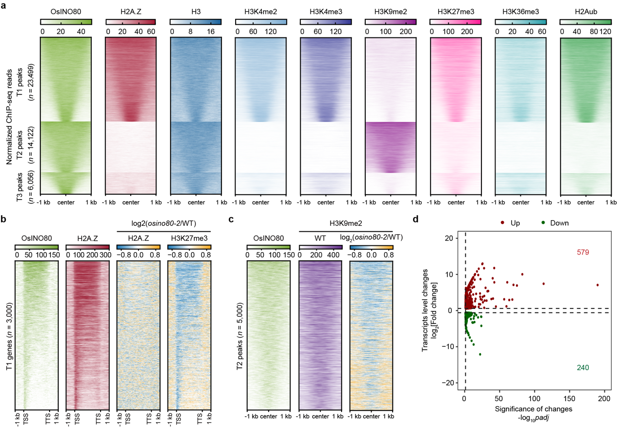 a. OsINO80在染色质上的分布特征; b.OsINO80缺失导致T1区域H3K27me3水平下降;c.OsINO80缺失导致T2区域H3K9me2水平下降; d.OsINO80缺失导致转座子激活