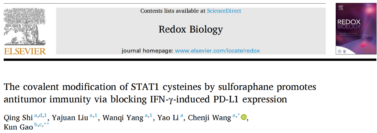 2025年2月17日,贝博体育官网 王陈继团队、上海市第一妇婴保健院/同济大学附属妇产科医院高昆团队合作在Redox Biology在线发表了题为 “The covalent modification of STAT1 cysteines by sulforaphane promotes antitumor immunity via blocking IFN-γ-induced PD-L1 expression”的研究论文。该研究揭示了SFN通过共价修饰STAT1蛋白的半胱氨酸残基,阻断IFN-γ诱导的PD-L1表达,从而增强抗肿瘤免疫的分子机制。