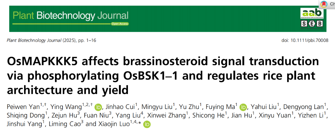2025年2月19日,罗小金课题组在Plant Biotechnology Journal杂志上发表了题为“OsMAPKKK5 Affects Brassinosteroid Signal Transduction via Phosphorylating OsBSK1-1 and Regulates Rice Plant Architecture and Yield”的研究论文。该研究揭示了OsMAPKKK5通过磷酸化水稻油菜素内酯(BR)信号细胞膜受体OsBSK1-1,抑制BR信号传导,从而调控水稻株型和产量的分子遗传机制。