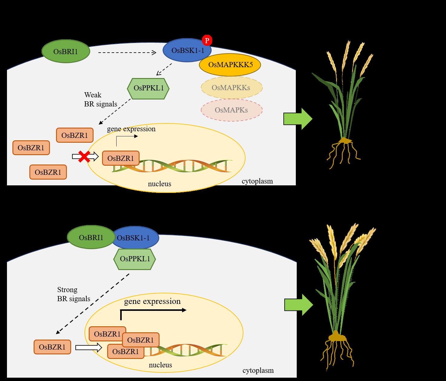 图注:OsMAPKKK5和OsBSK1-1调控水稻株高和产量性状的分子机制