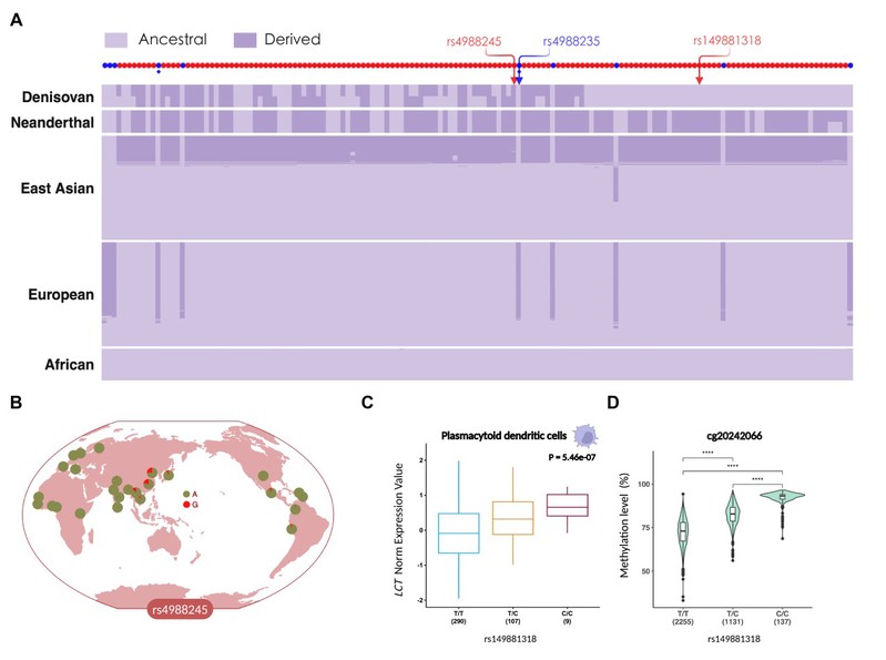 研究团队首先基于全球现生人群的全基因组测序数据,在东亚人群 2q21.3区域发现一种高频(约25%)单倍型(图1),并且发现这种单倍型与LCT基因的表达以及LCT启动子区域cg20242066位点的甲基化水平有关,与此前报道的影响欧洲人群乳糖耐受性的遗传变异–13910*T (rs4988235)有相似的效应,提示该单倍型可能影响东亚人群的乳糖耐受性。但这种东亚人常见的单倍型在非洲和欧洲人群中完全缺失,进一步表明东亚人群乳糖耐受与欧洲非洲人群存在不同的遗传基础。